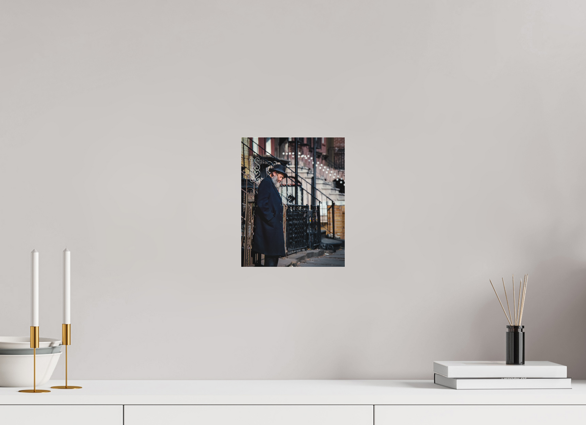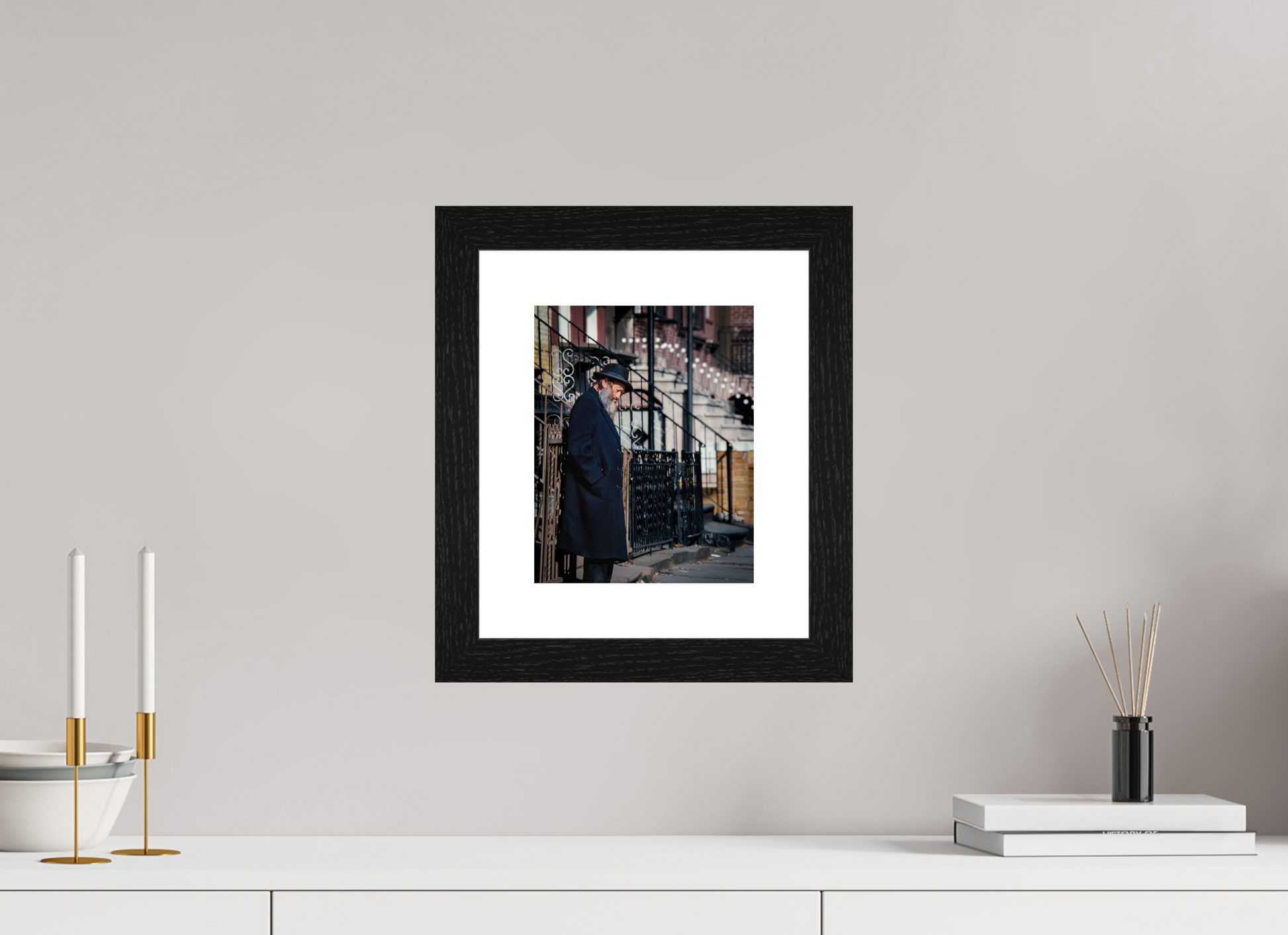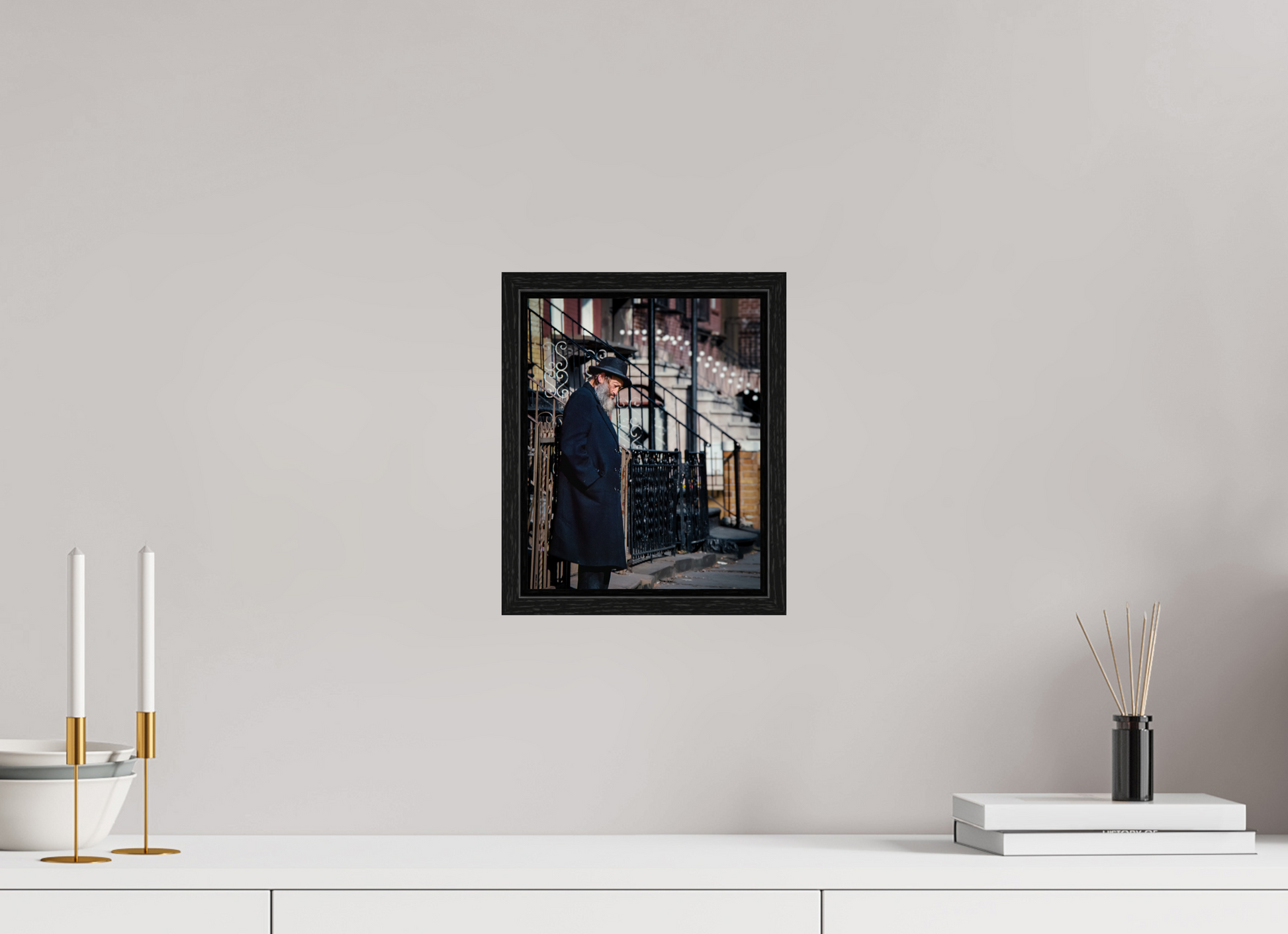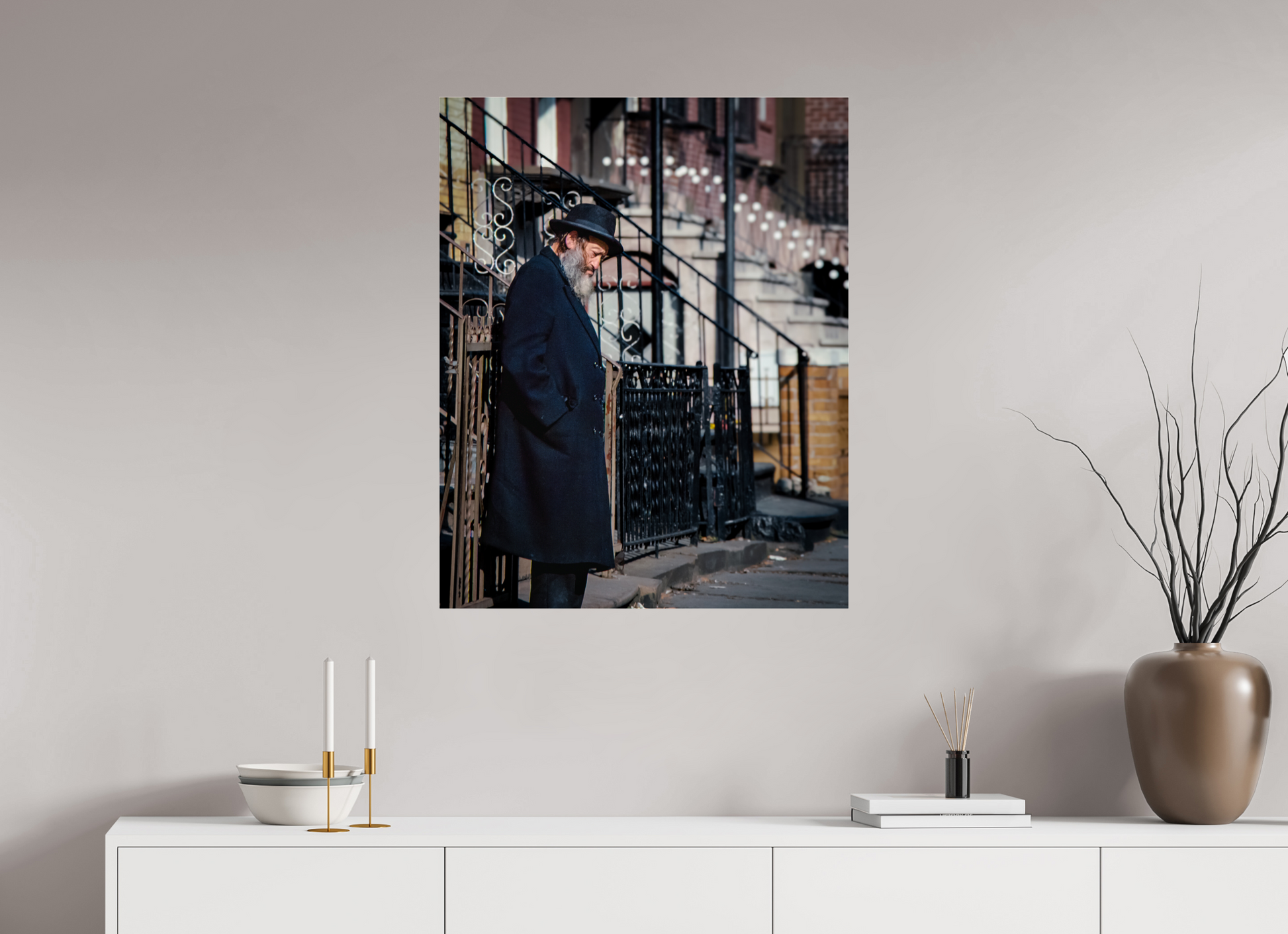 An elderly man stands in quiet reflection, framed by the intricate patterns of urban architecture.