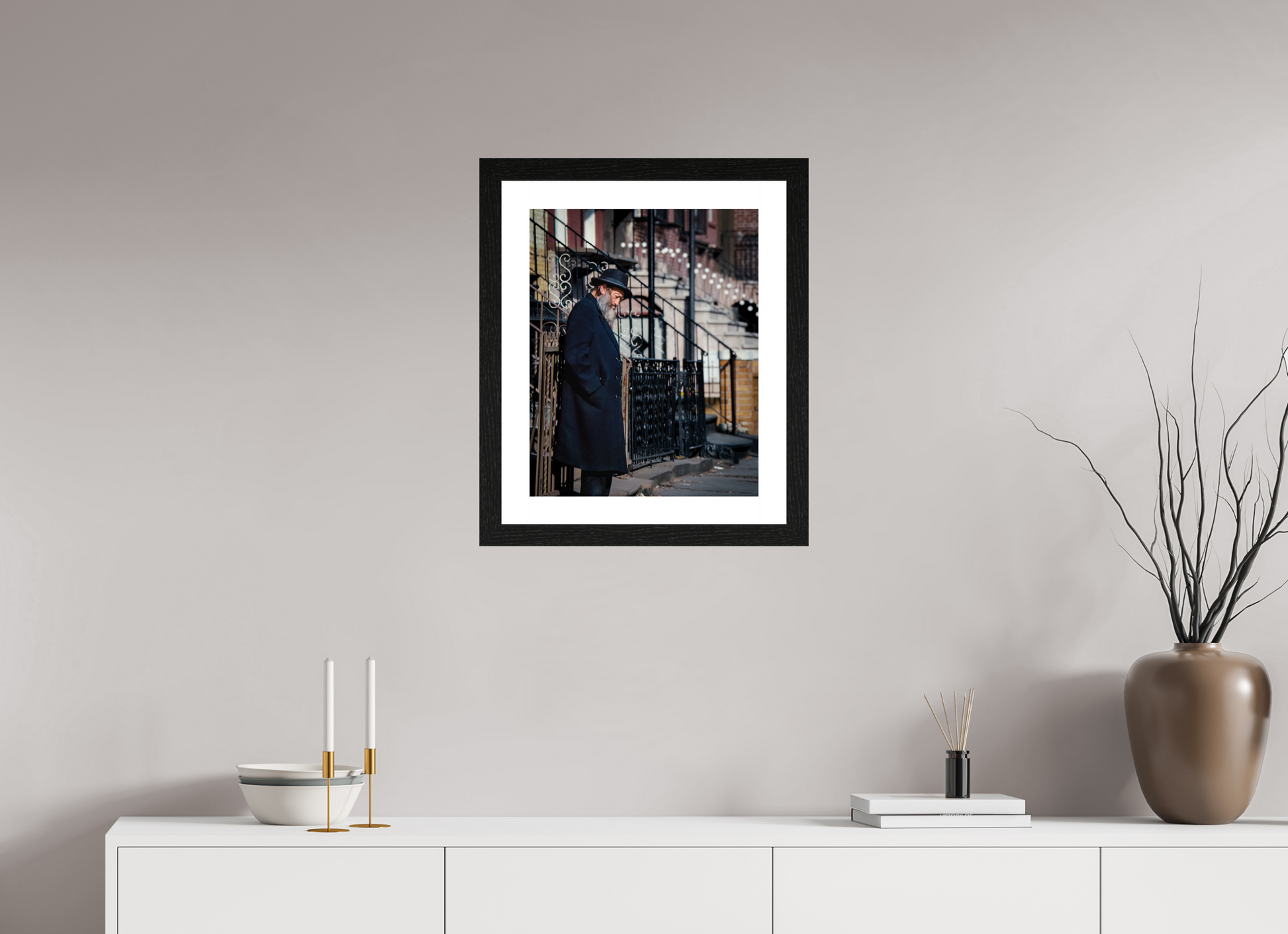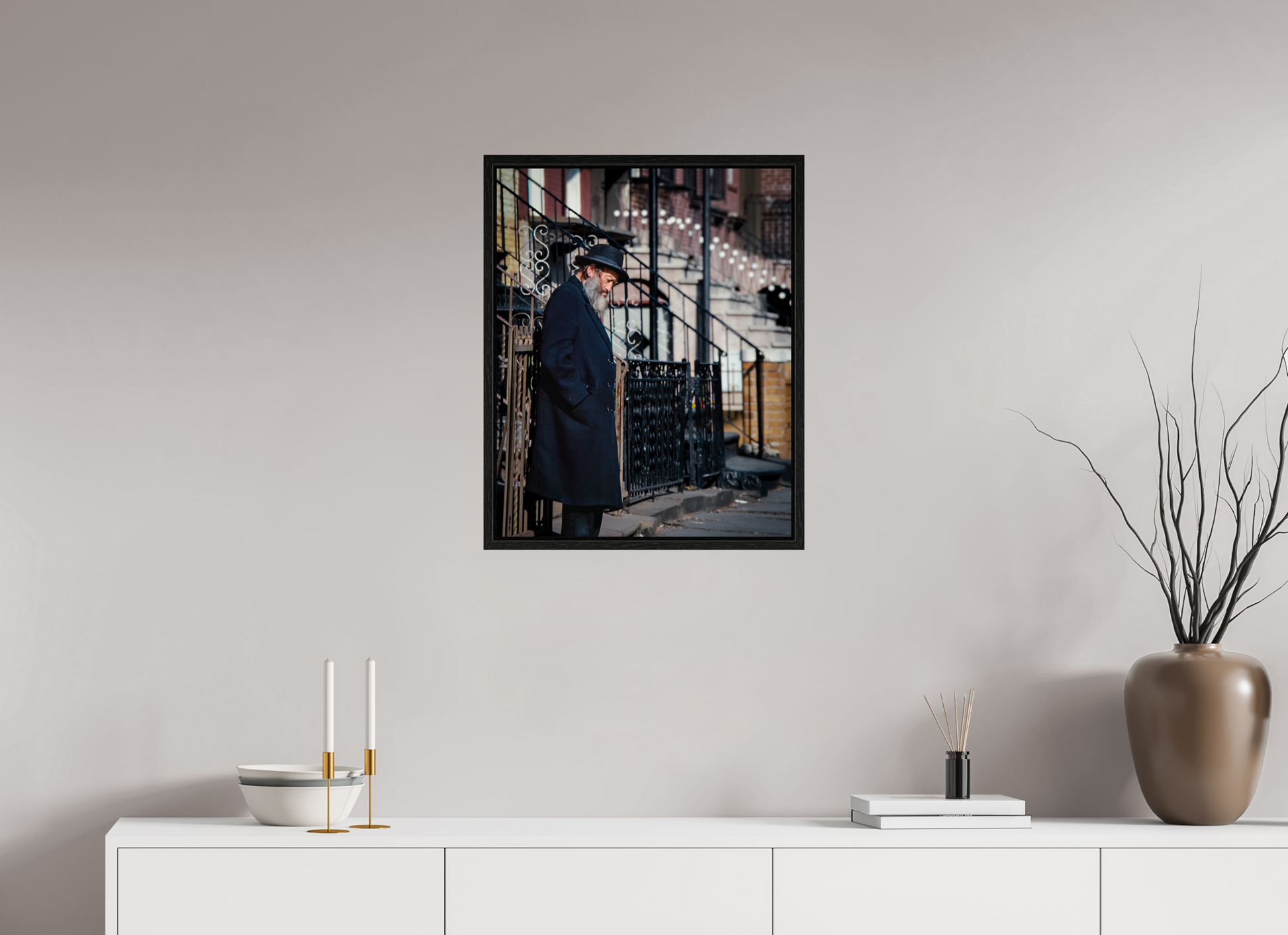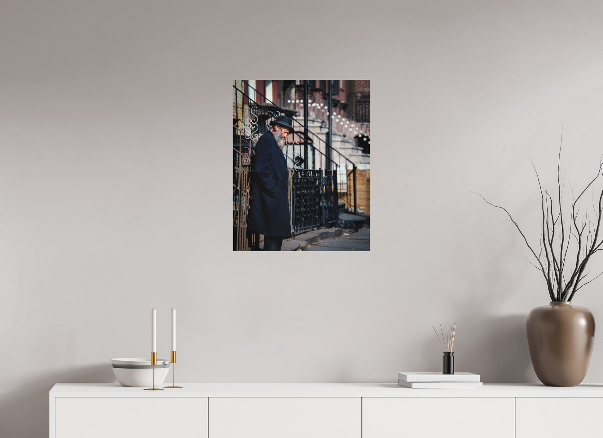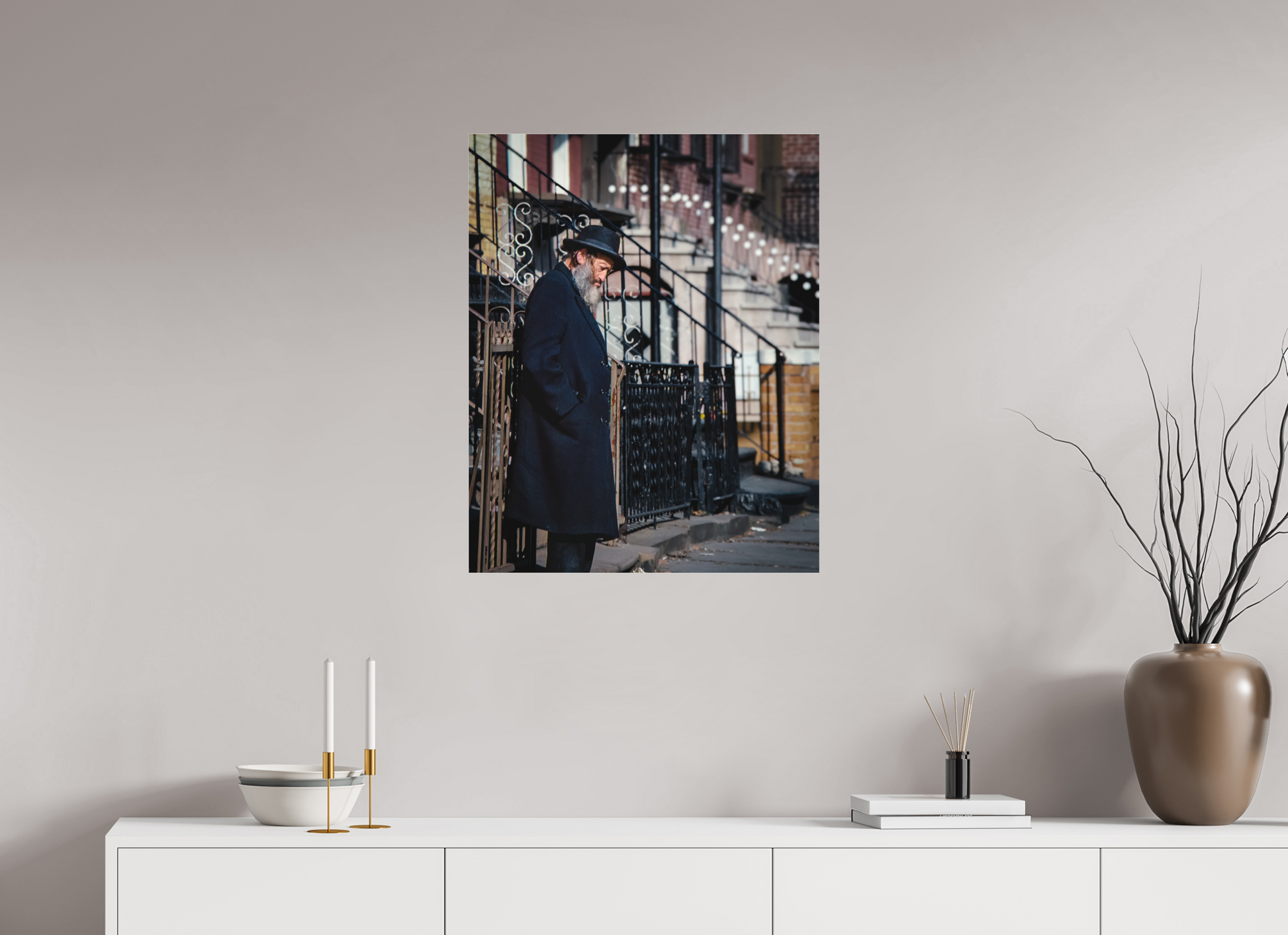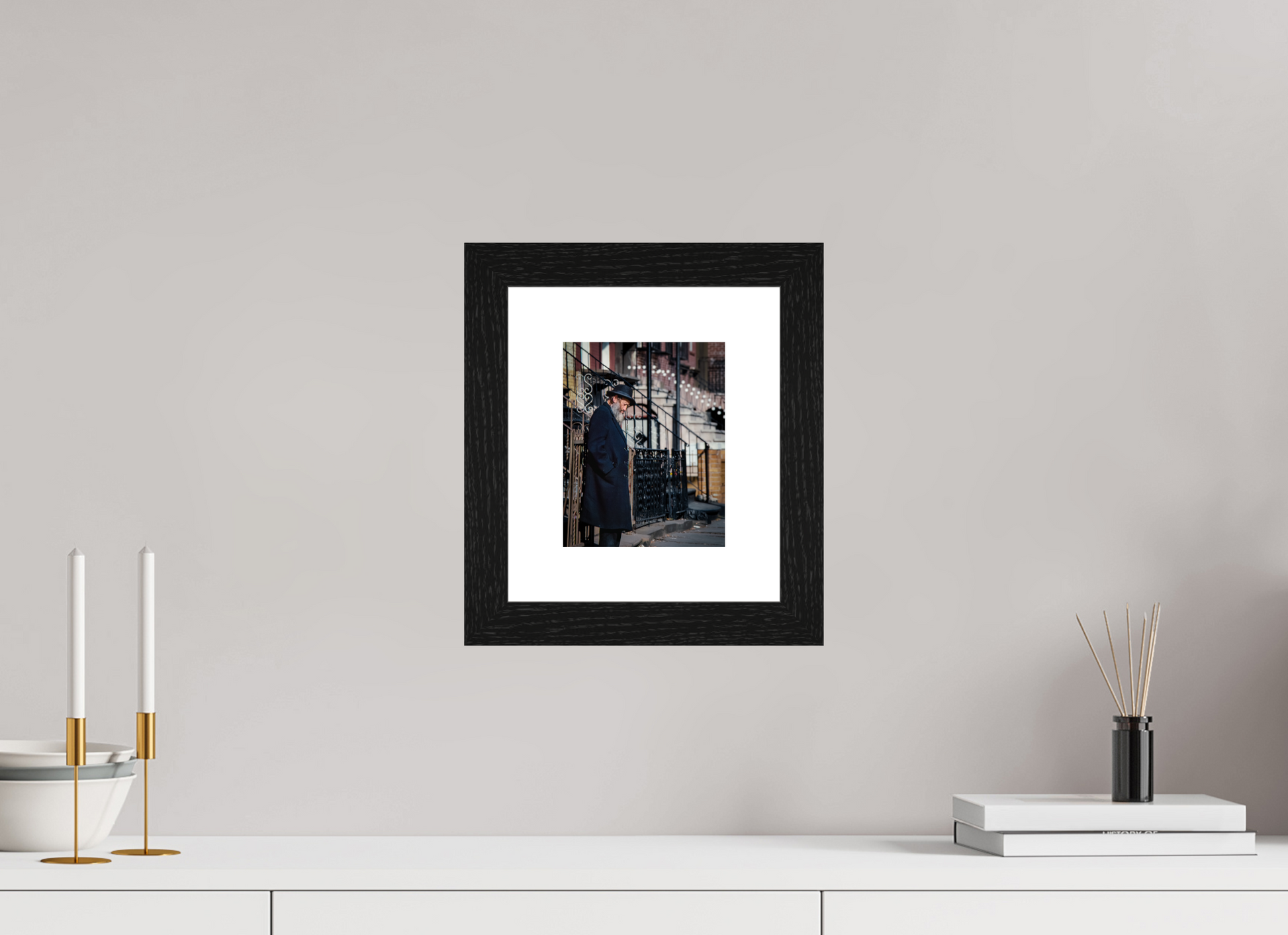 An elderly man stands in quiet reflection, framed by the intricate patterns of urban architecture.