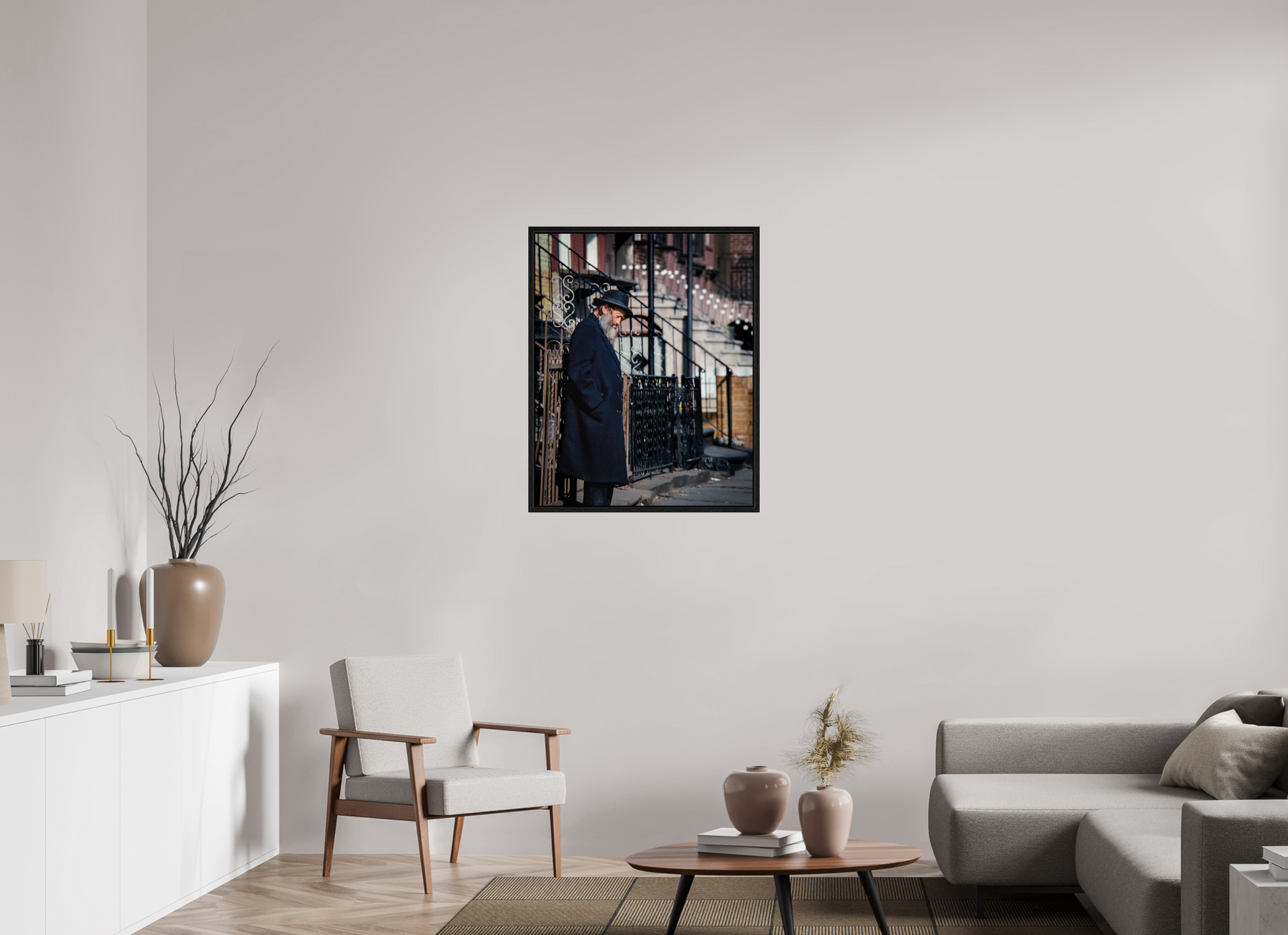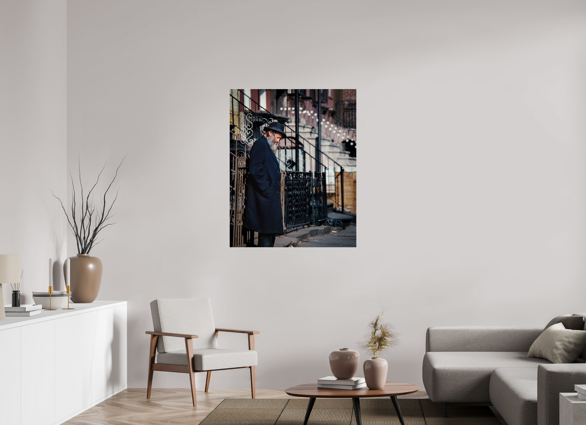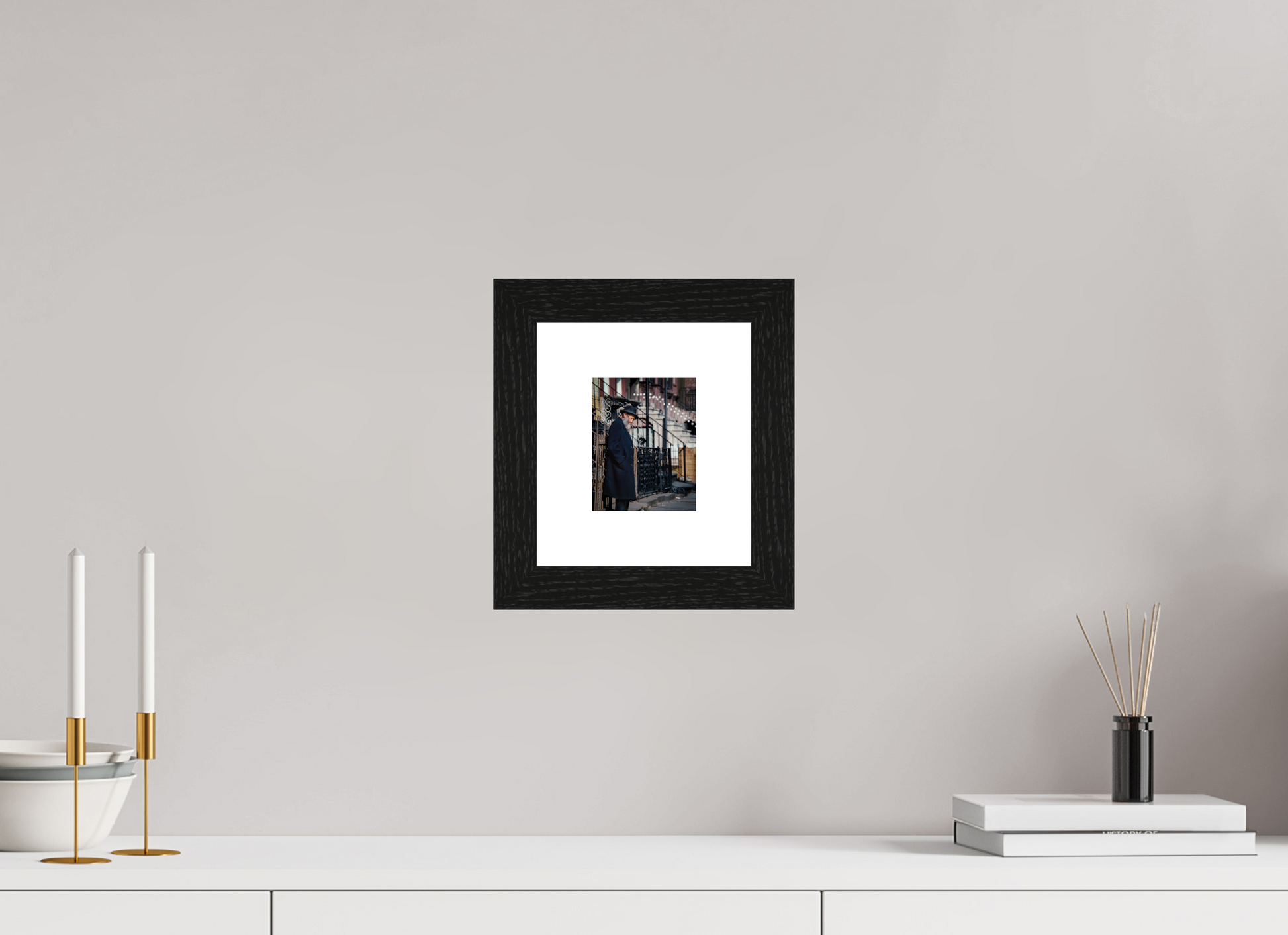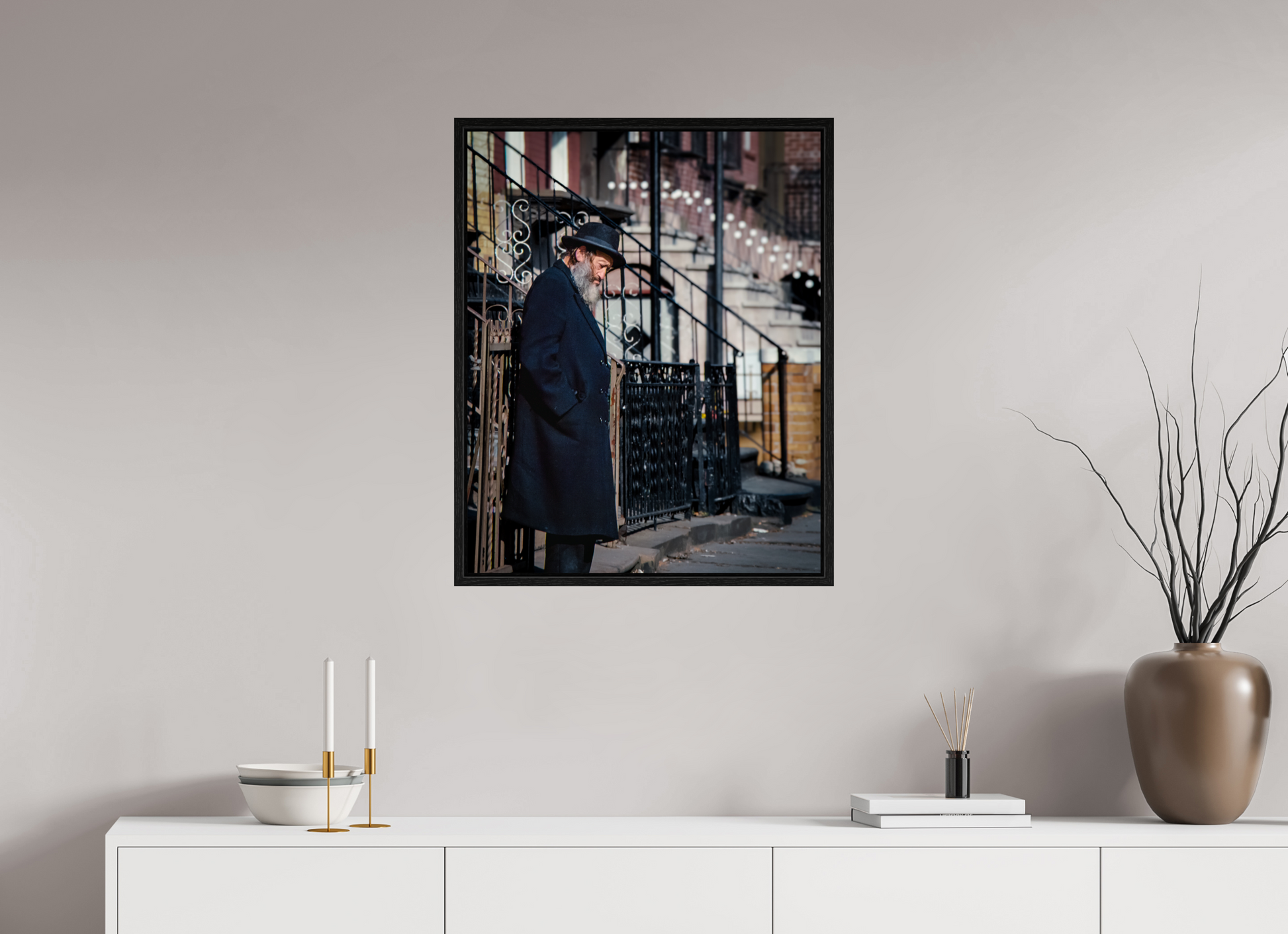 An elderly man stands in quiet reflection, framed by the intricate patterns of urban architecture.