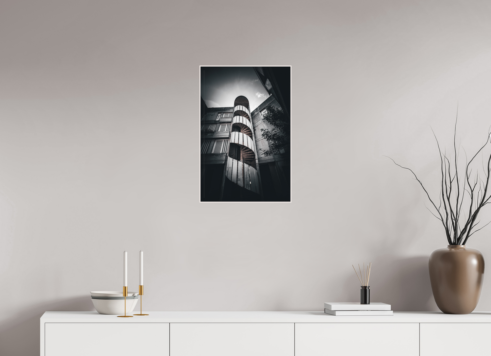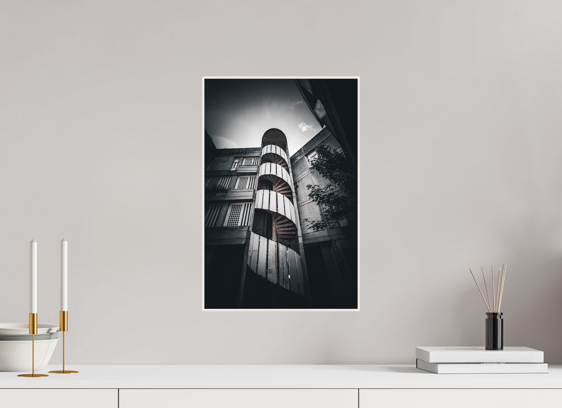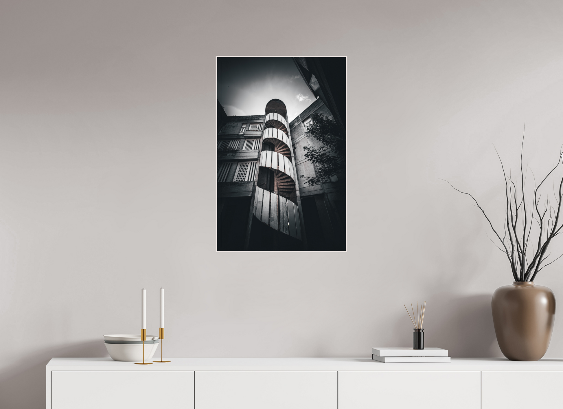 This striking image captures the bold lines and stark contrasts of a brutalist architectural marvel. The spiraling staircase, encased in concrete, ascends towards a dramatic sky, embodying the raw beauty and strength of the structure. The interplay of light and shadow accentuates the geometric precision and the unyielding nature of the materials used.