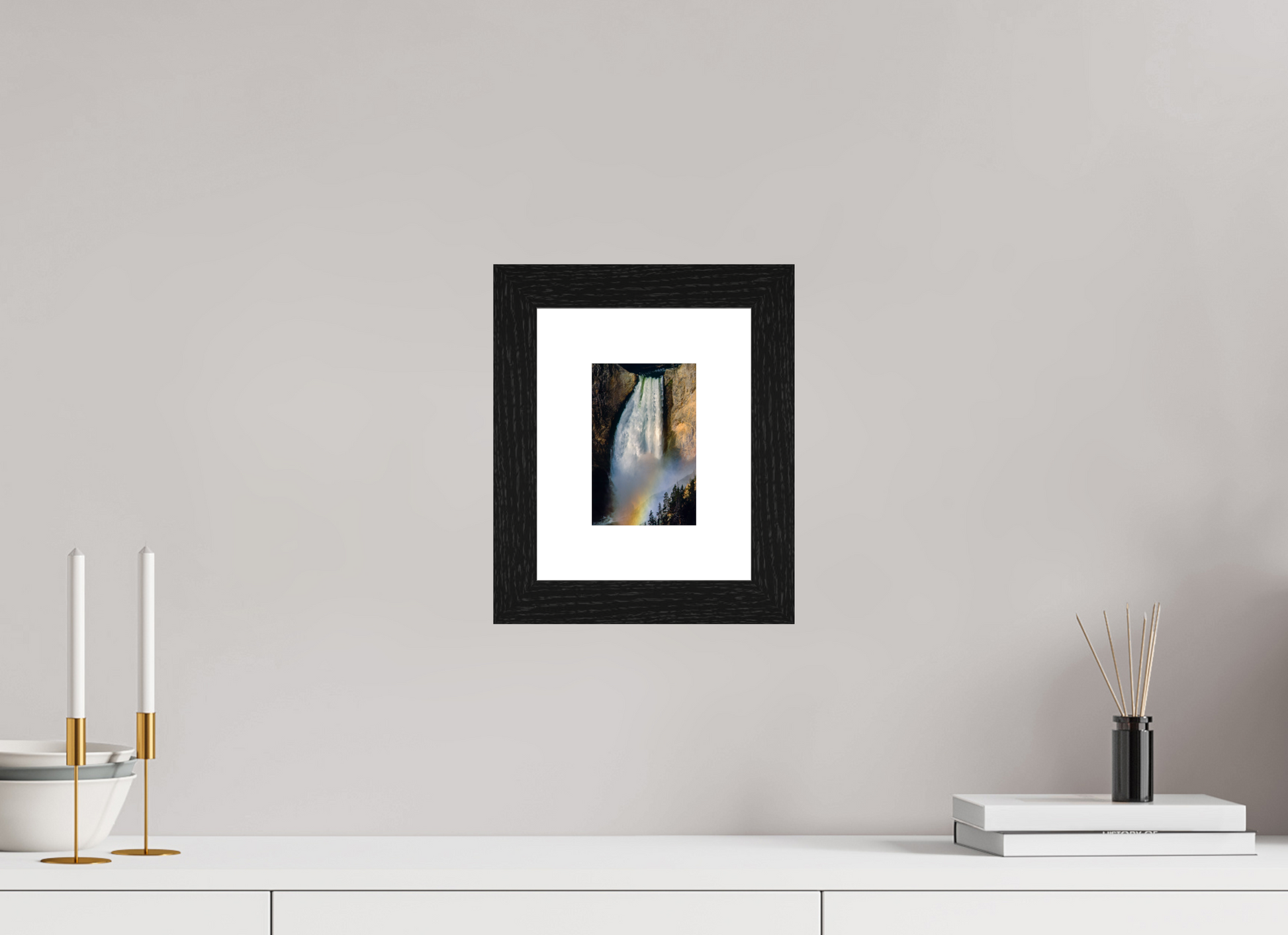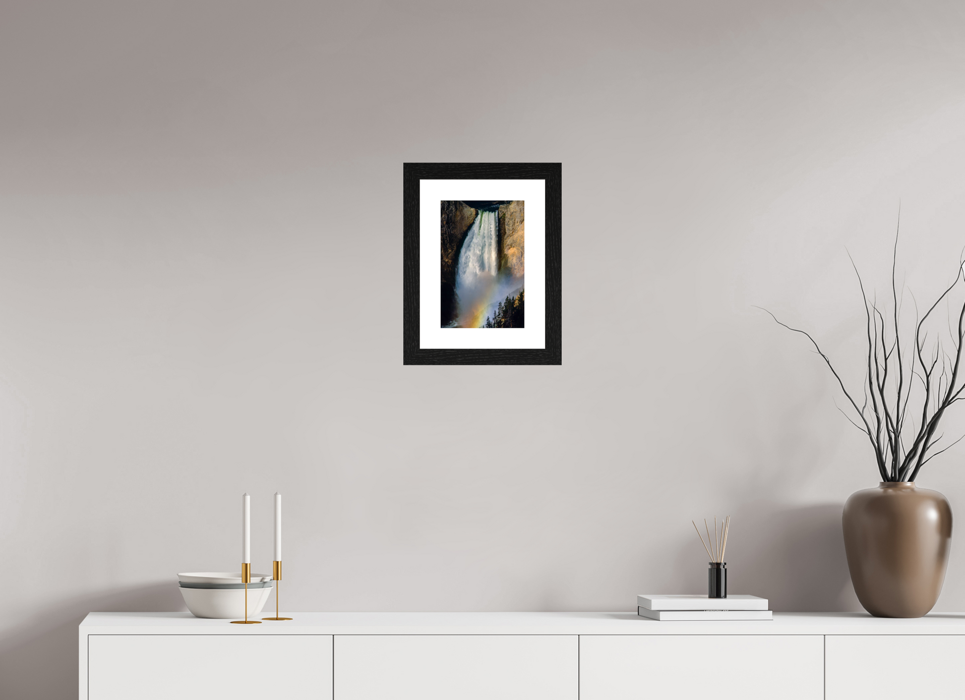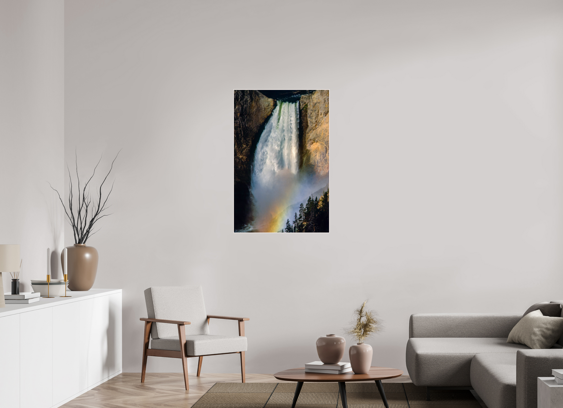 A majestic waterfall cascades down the cliffside, its mist creating a prism of colors as a rainbow arches across the sky, capturing the raw beauty and magic of nature.
