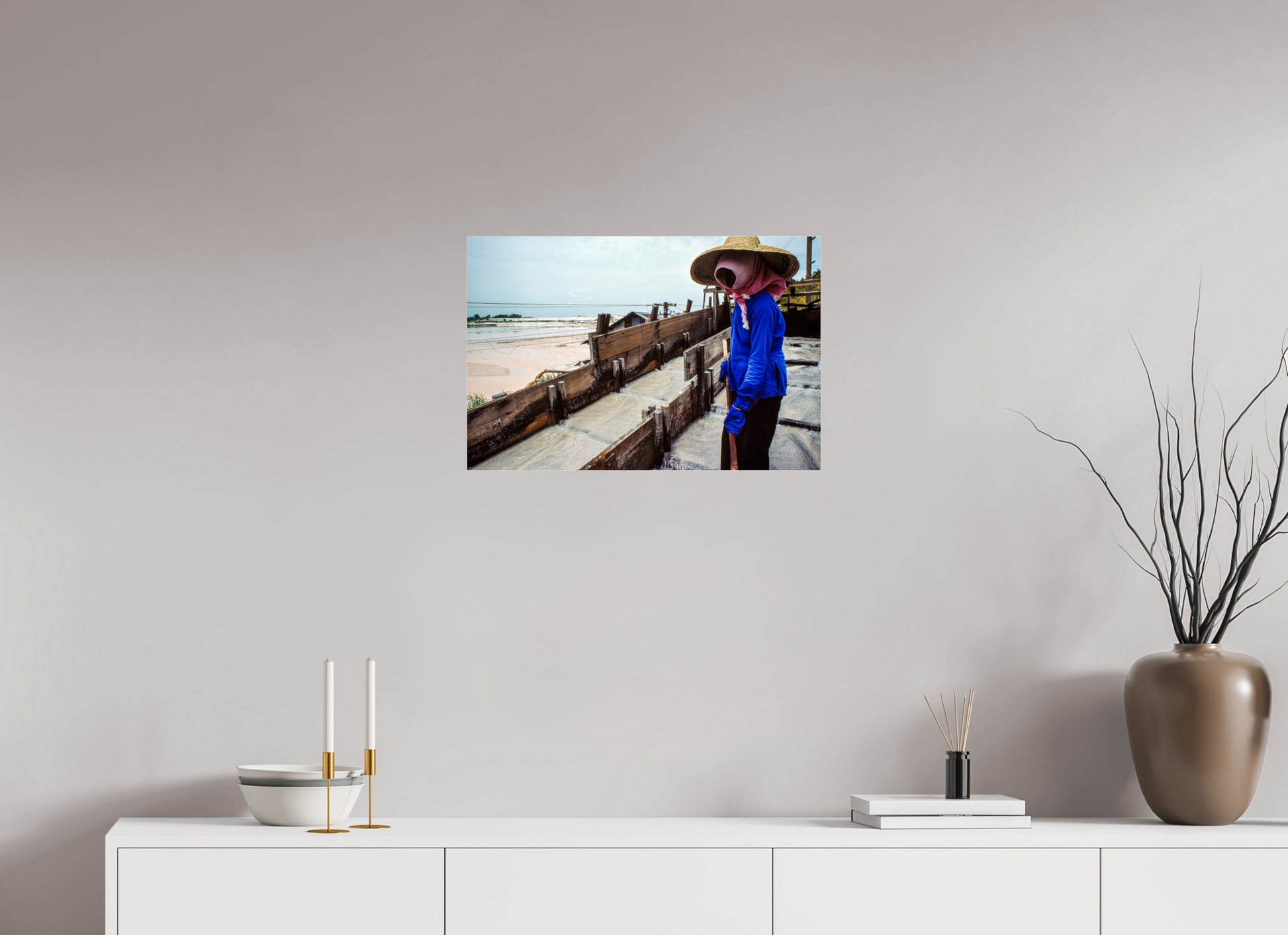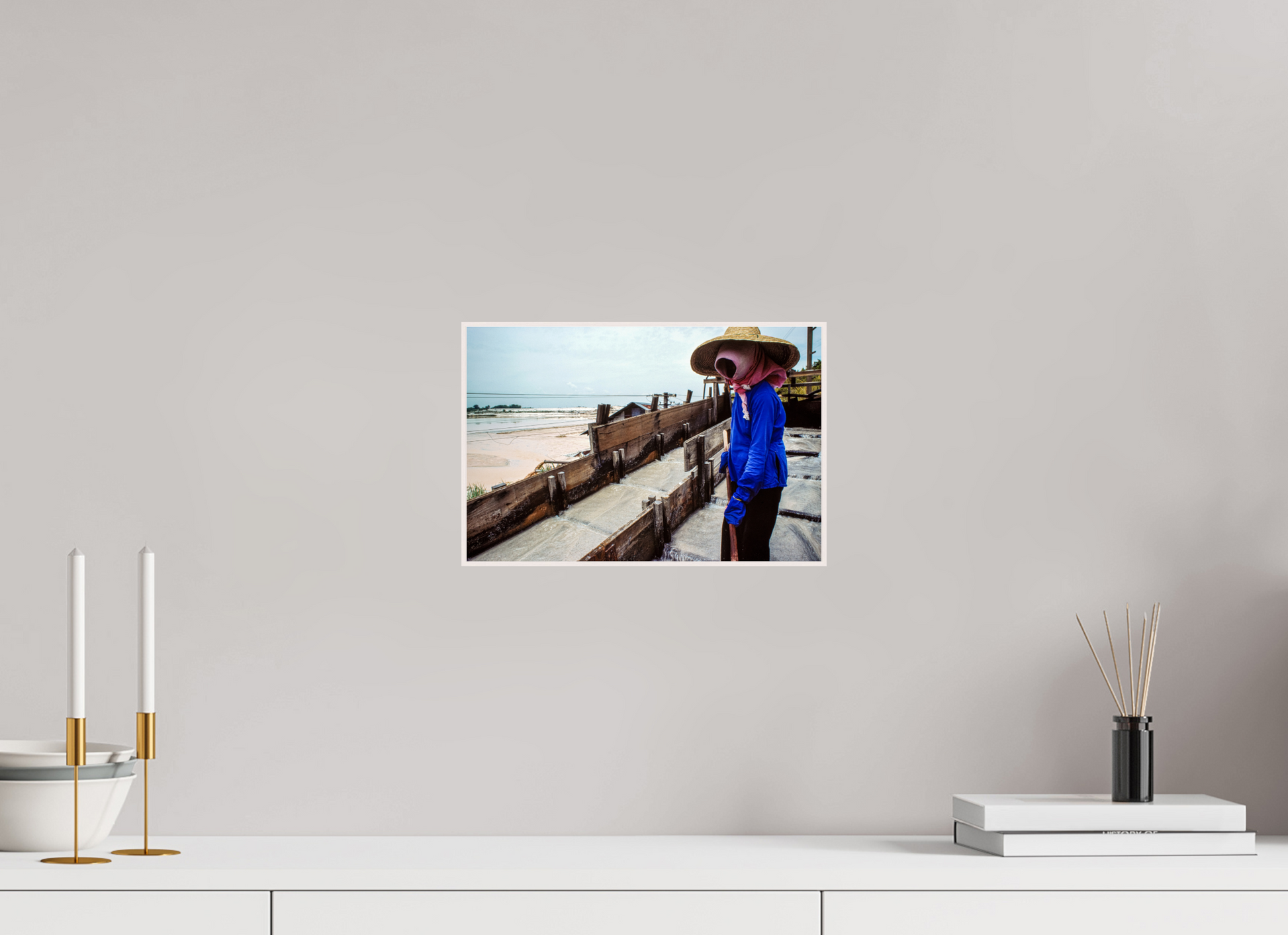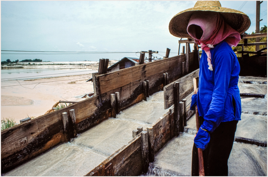 A worker, adorned in protective gear, diligently tends to the salt pans in a Malaysian mine, their silhouette a testament to the enduring spirit of labor and the timeless connection between humans and the earth.