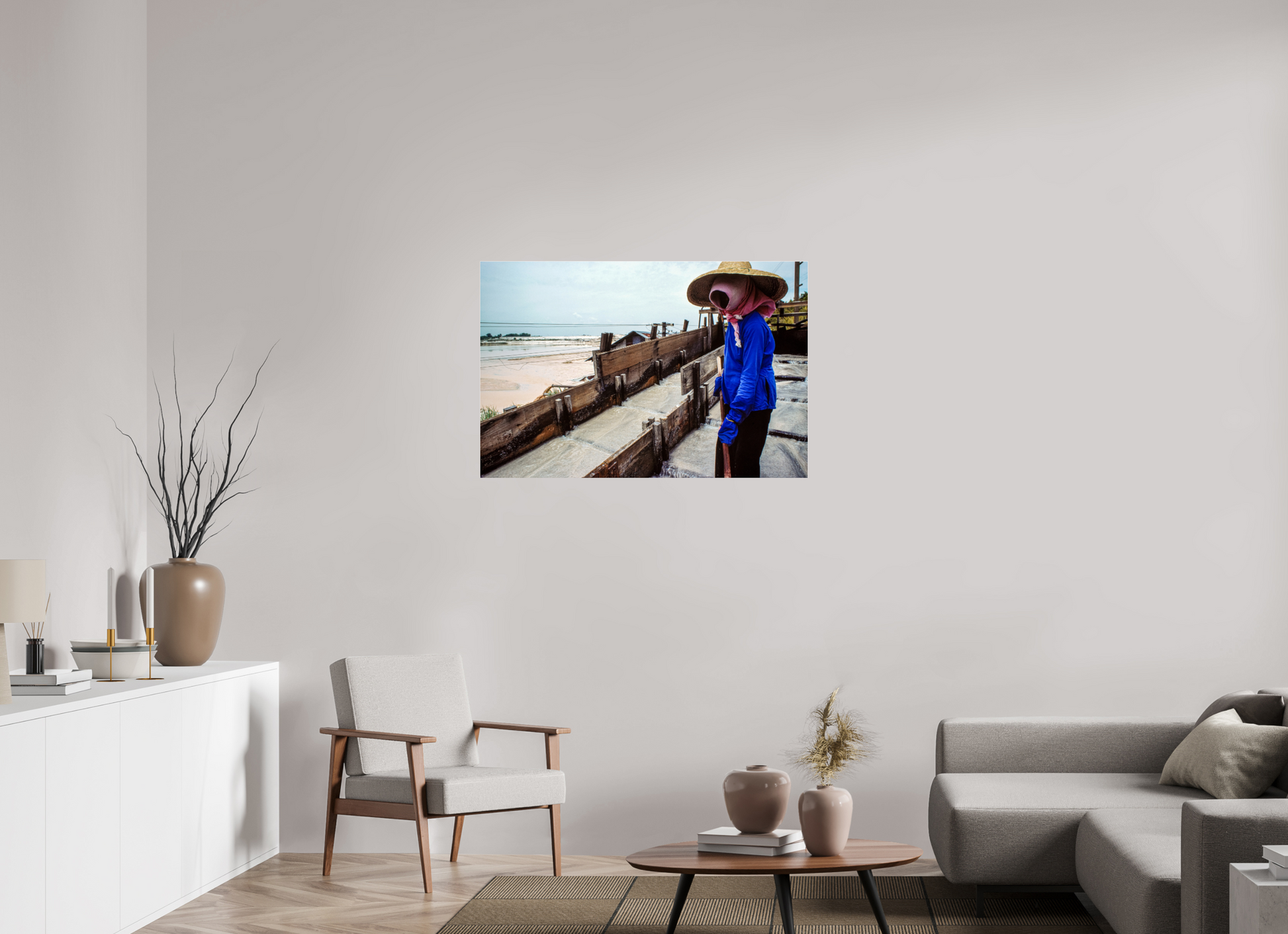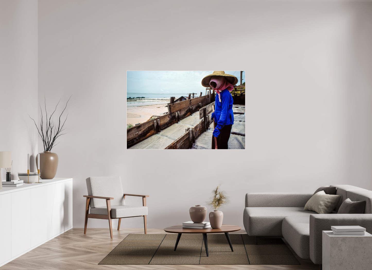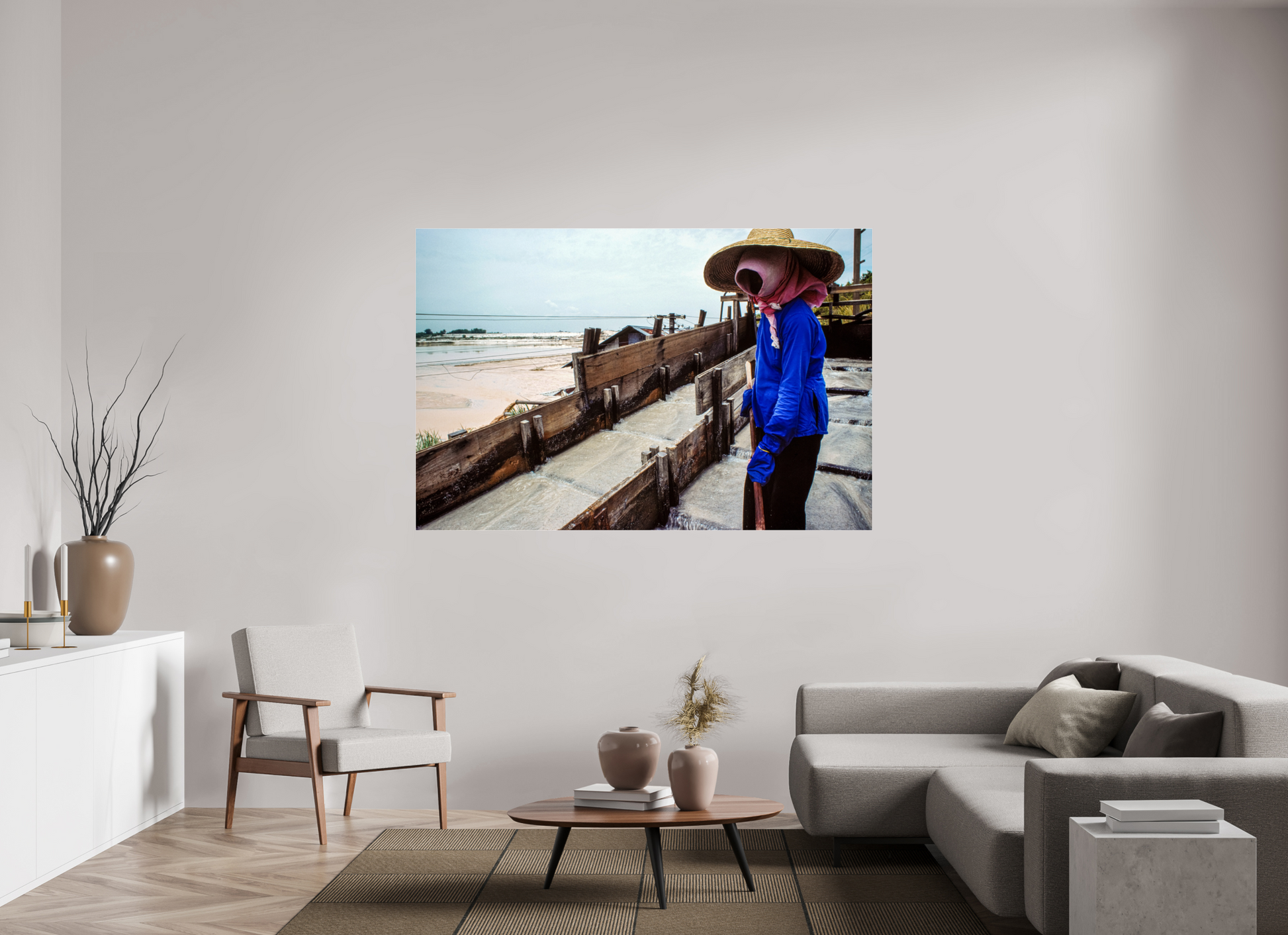 A worker, adorned in protective gear, diligently tends to the salt pans in a Malaysian mine, their silhouette a testament to the enduring spirit of labor and the timeless connection between humans and the earth.